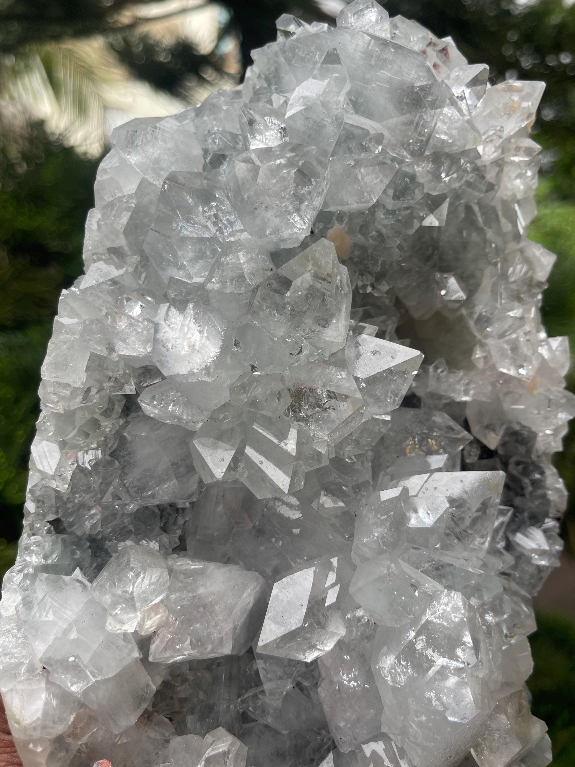 Glossy apophyllite crystal with stilbite on blue chalcedony matrix standing piece