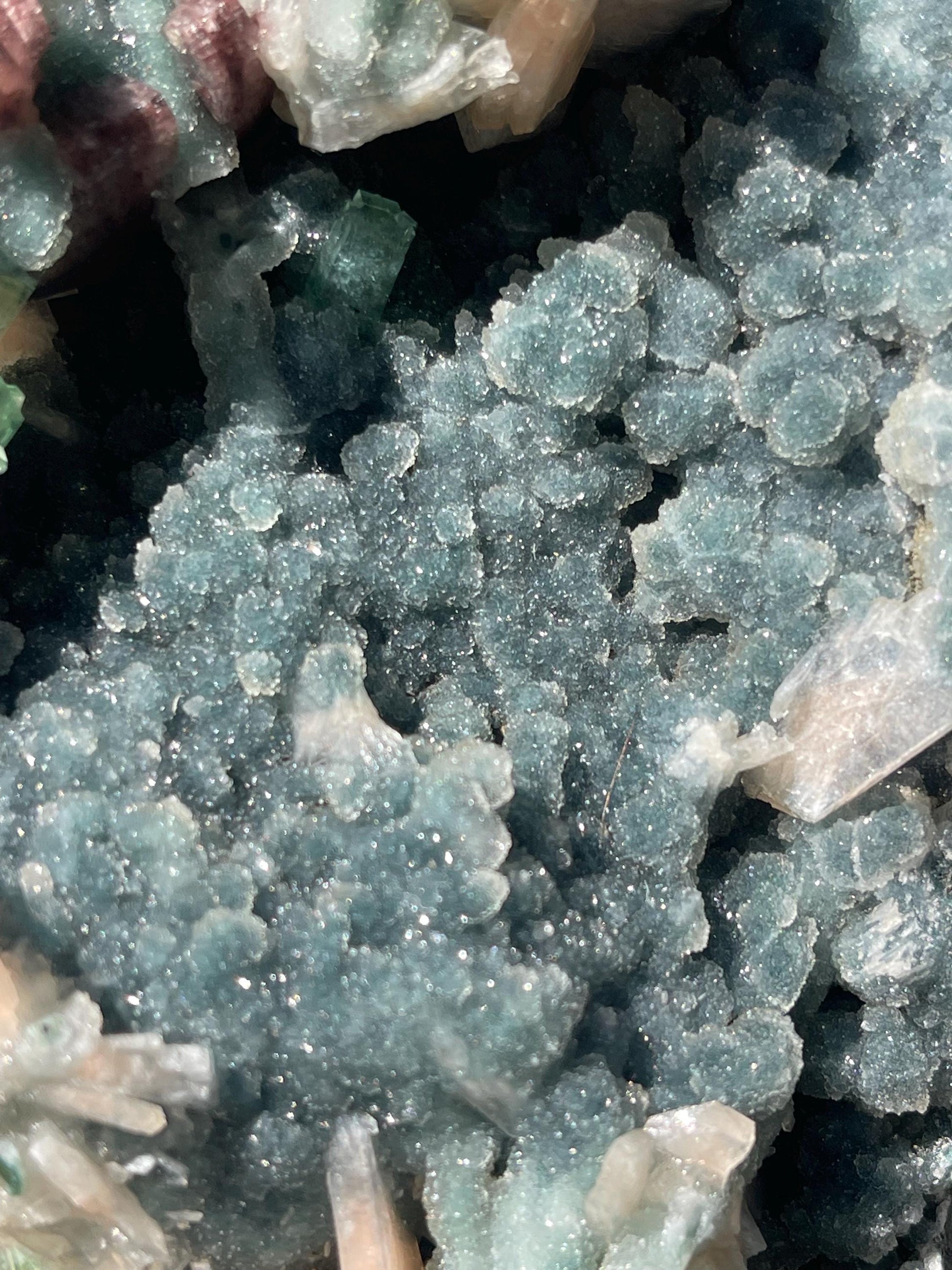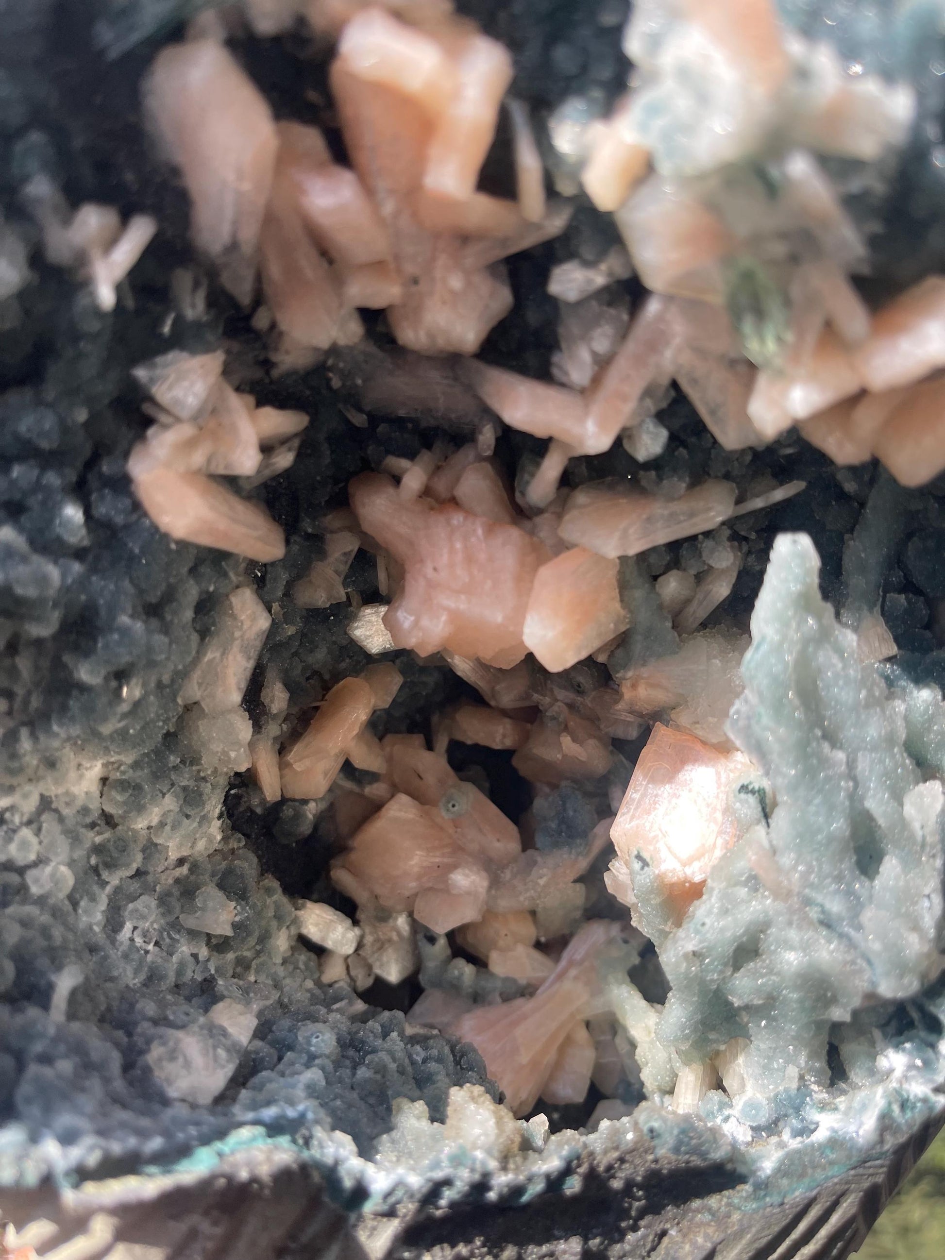Heulandite, Stilbite & Green Apophyllite on Black Coral Geode
