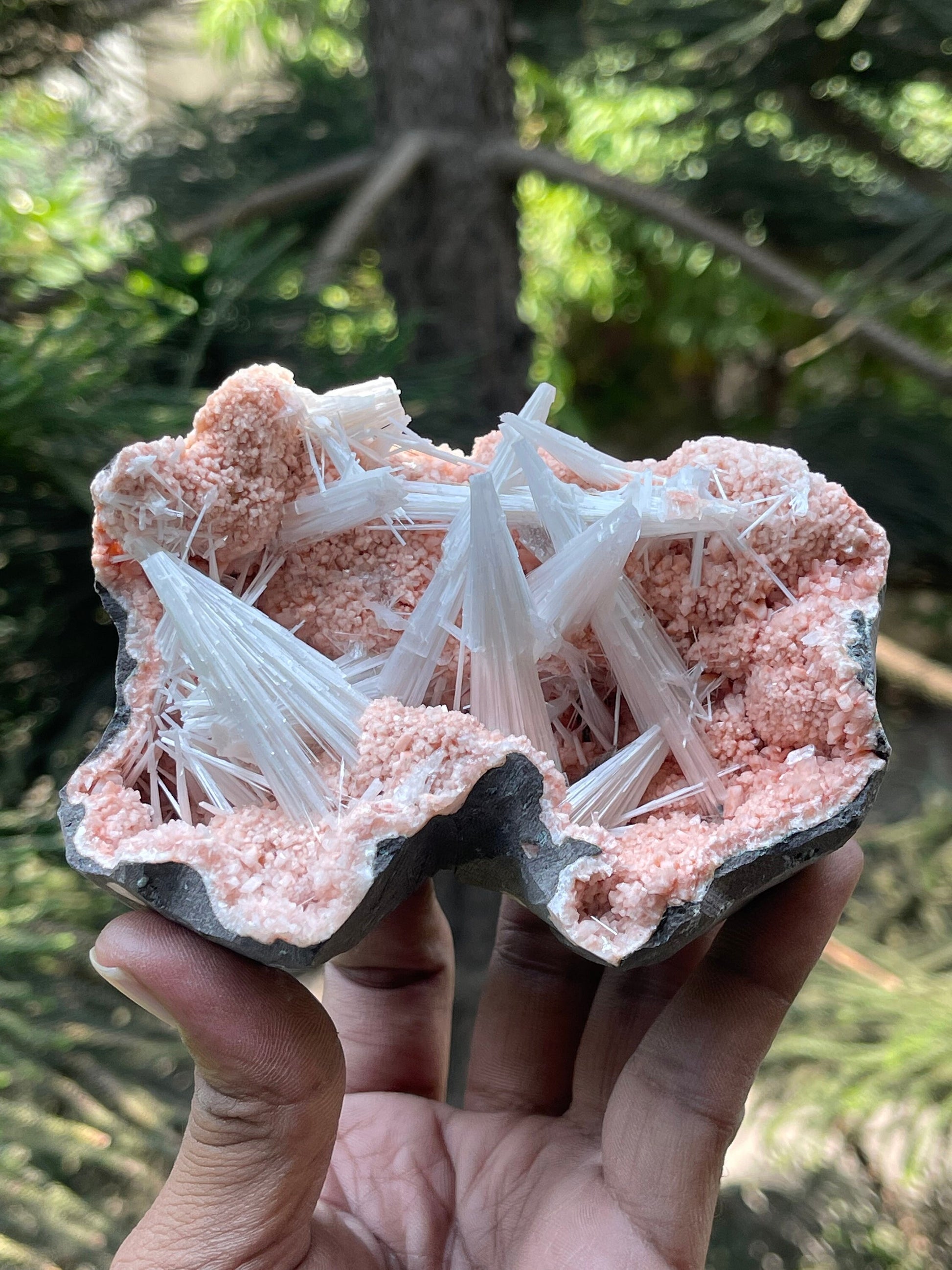 Multiple scolecite sprays on orange heulandite matrix natural specimen